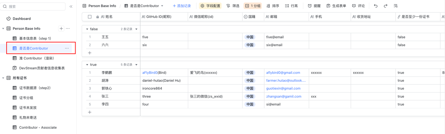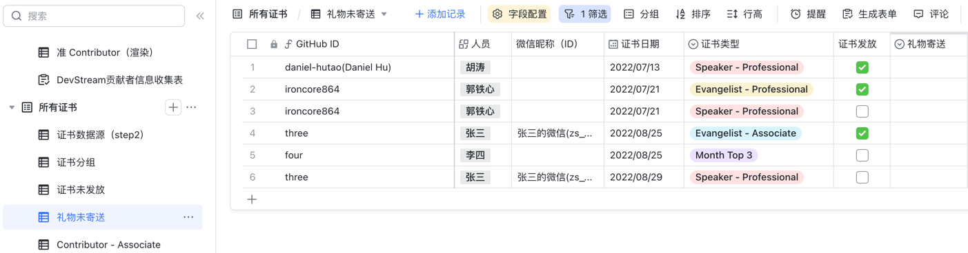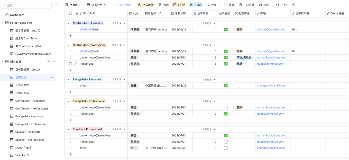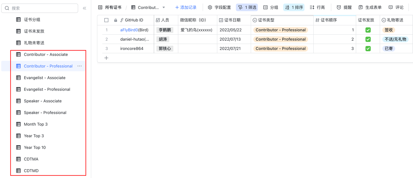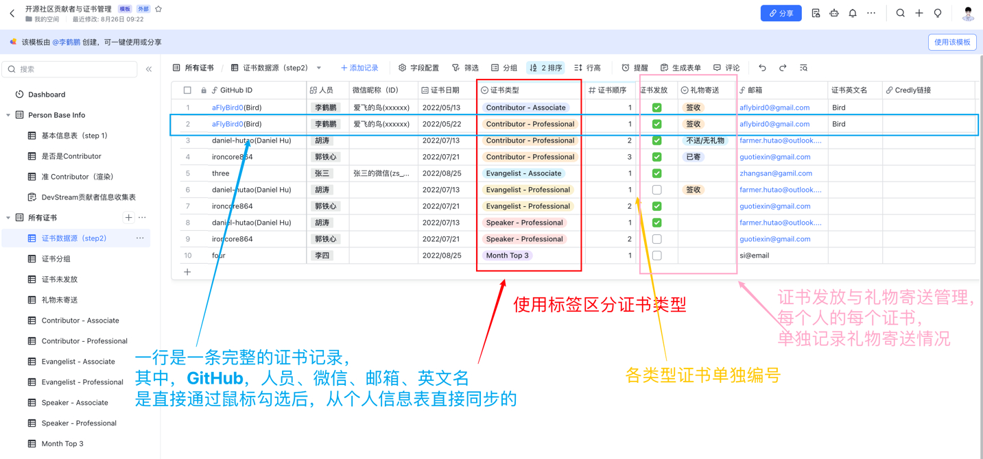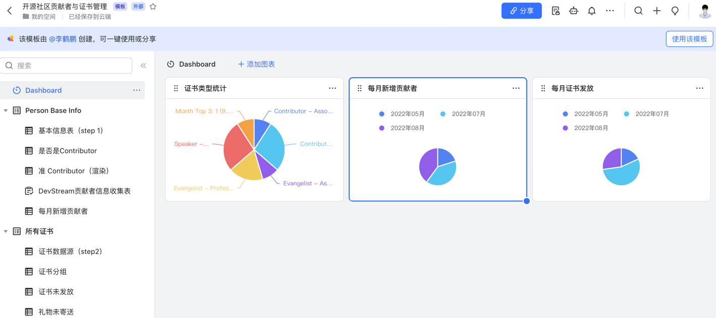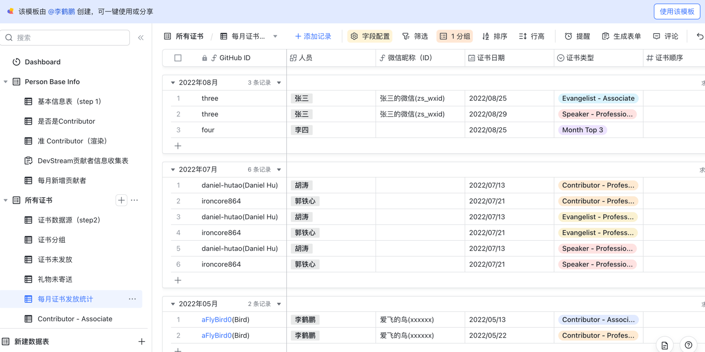 以上的多维表格,已经整理成了模板,可以一键使用:开源社区贡献者与证书管理-模板。