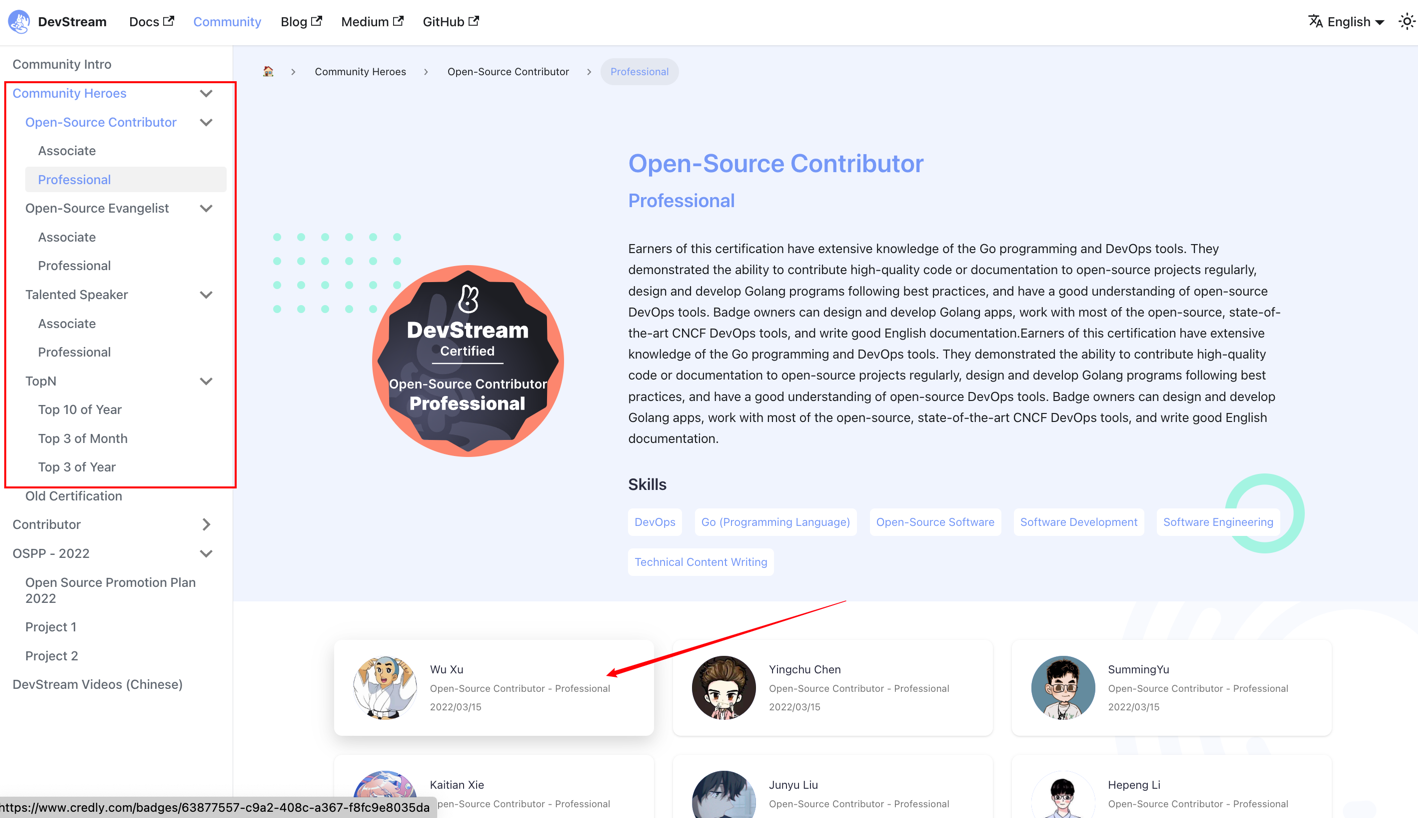 DevStream 目前共有开源贡献者、布道师、演说家、TopN几大类证书(徽章),每种证书的每个细分类型都使用一个单独的页面来展示贡献者们。