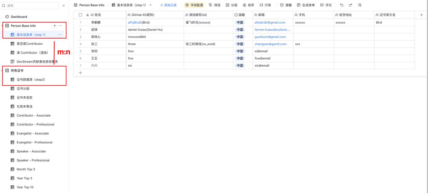 我们基于飞书多维表格来完成了复杂的需求实现,将个人信息与证书颁布信息拆分成两个表格,二者采用多对多的关联形式。