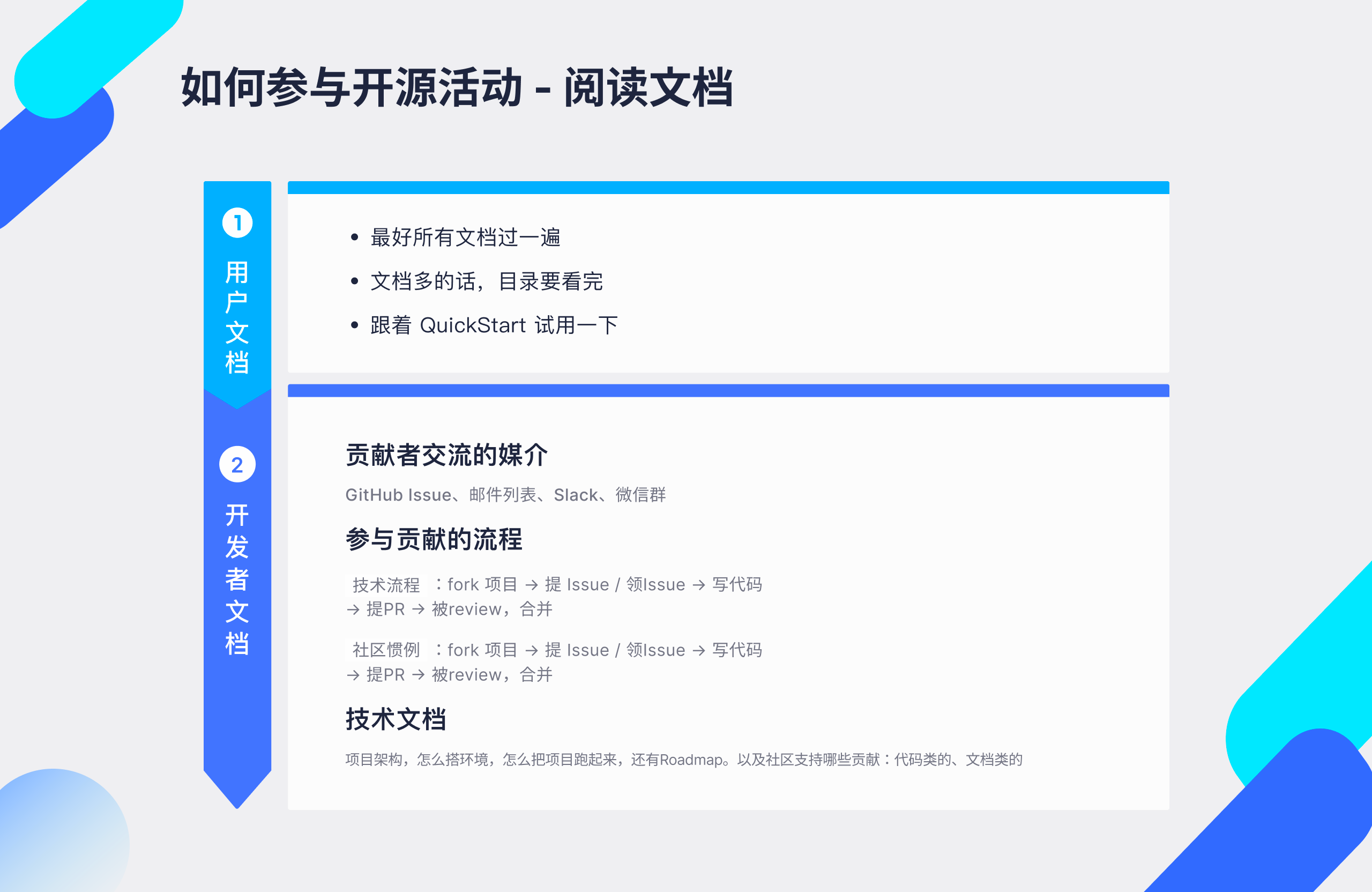 - 用户文档:项目是什么,解决了什么问题,有什么优点,哪些基本概念。一般的项目都会有个quick start,至少要把这个跑一遍。想成为开发者,你必须要先成为它的用户。