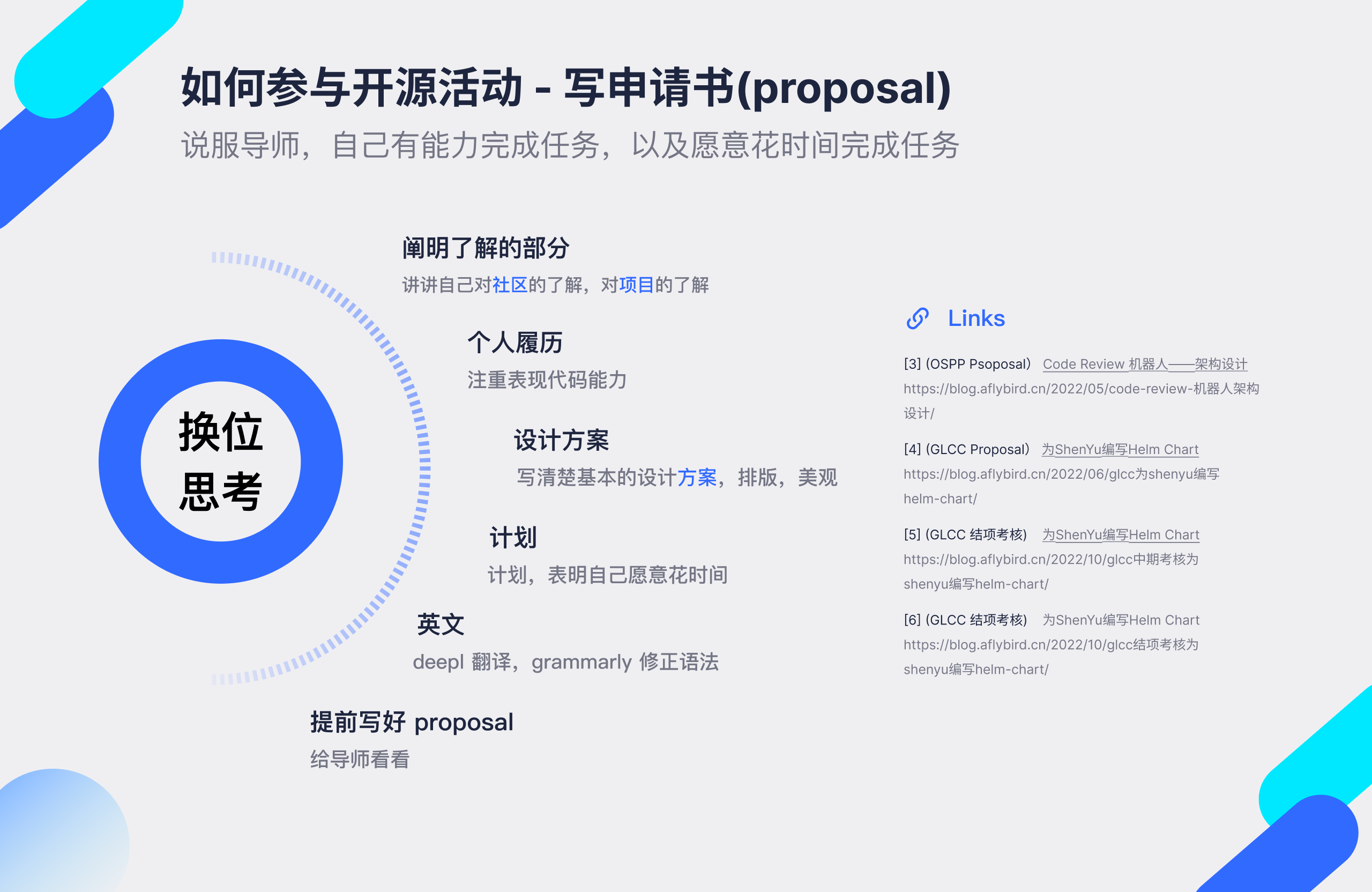 - 开源社区的一大理念在于交流与协作。如果你和社区没有任何先前联系,只是提交申请书,导师怎么相信以后你能在开源社区多多沟通呢。