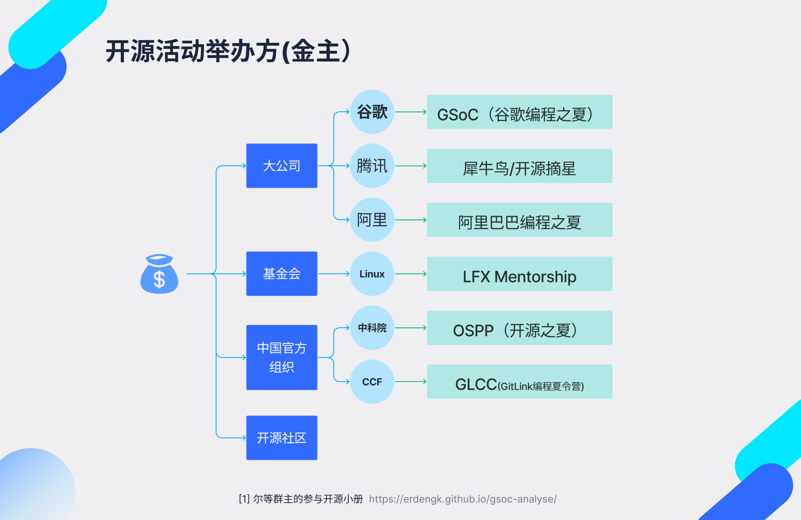- 基金会。比如 LFX mentorship 就是 Linux 基金会搞的。钱多,力度大。