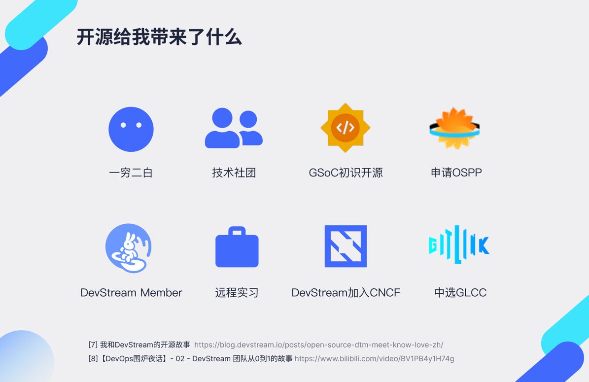 - 简历&圈子&人脉。首先是简历镀金;然后是能认识更多的人,说不定以后面试的人就是你的开源伙伴;以及你会加入一个领域知识圈,主动&&被动地收获更多的信息。就像滚雪球一样。