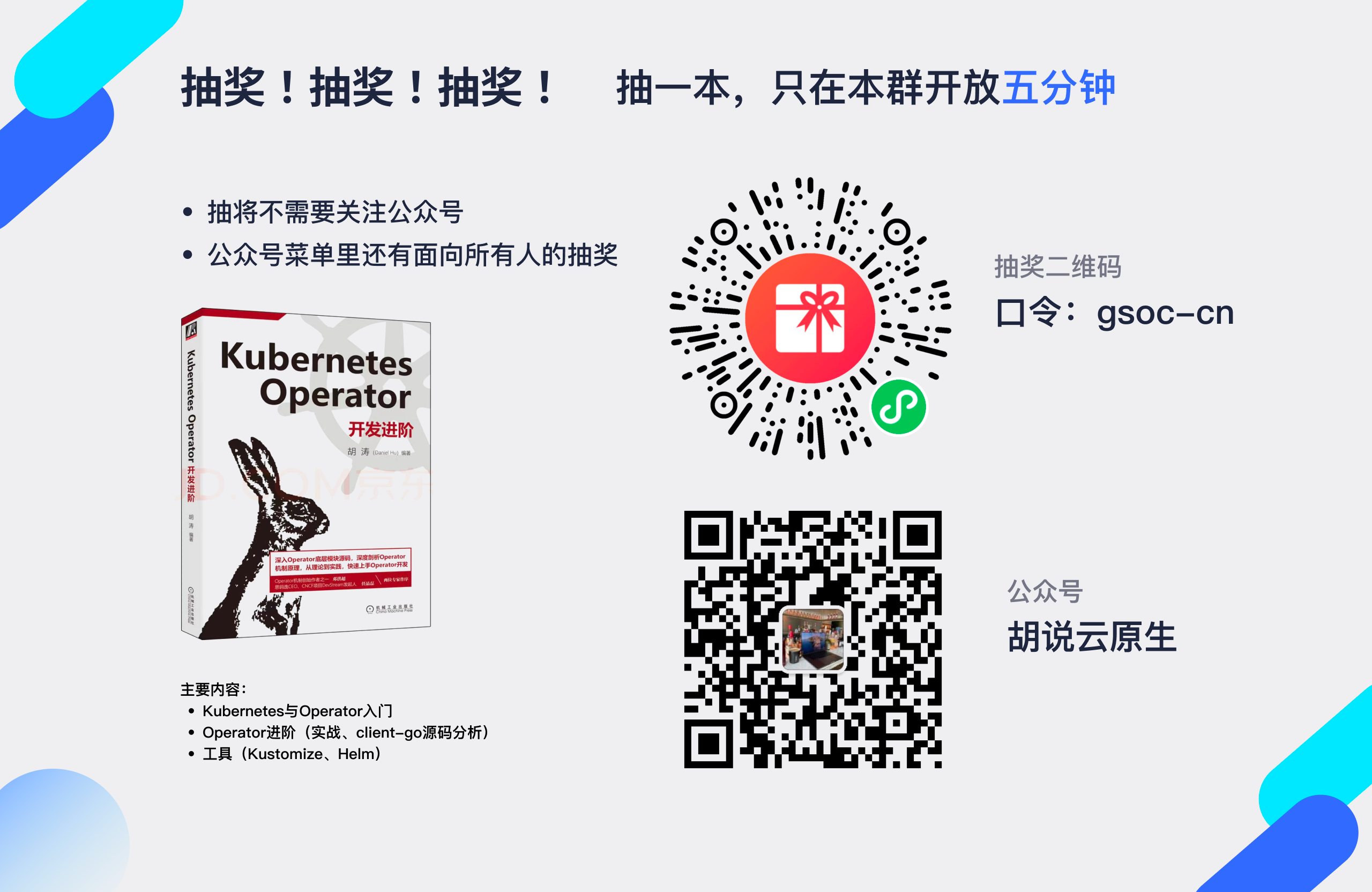 - 然后是实习的时候组内的一些文化,前Leader是清华+亚马逊的大佬,组内采取的是异步协作的方式。不会说发个消息需要你马上回复,有时间立即回复就好,大家互相信任。以及几乎不开会,因为长时间的开会容易打断造成工作效率低下,我们一般会开个共享文档,大家异步地阅读、评论。以及每周会有个和Mentor1对1的会议,每双周有个和Leader1对1的会议,我们除了会聊工作相关的东西,还会聊以后的发展,以及会聊对整个人生有益的,代码以外的事情。比如我的Mentor胡涛很会写博客,有自己的公众号,会和我谈博客与工作相关的东西。哦对,他这两天还写了一本书,叫《Kubernetes Operator开发进阶》,打个小广告。