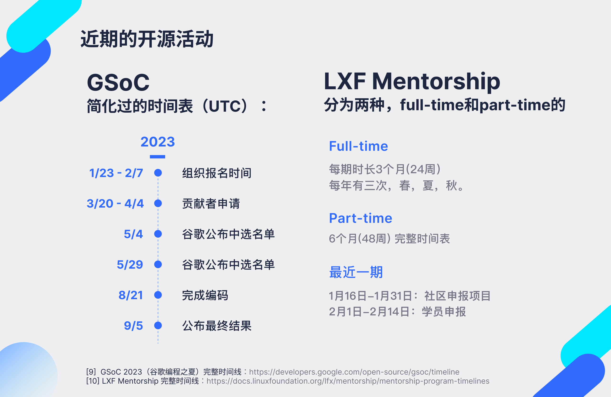 - 6个月(48周) 完整时间表:https://docs.linuxfoundation.org/lfx/mentorship/mentorship-program-timelines