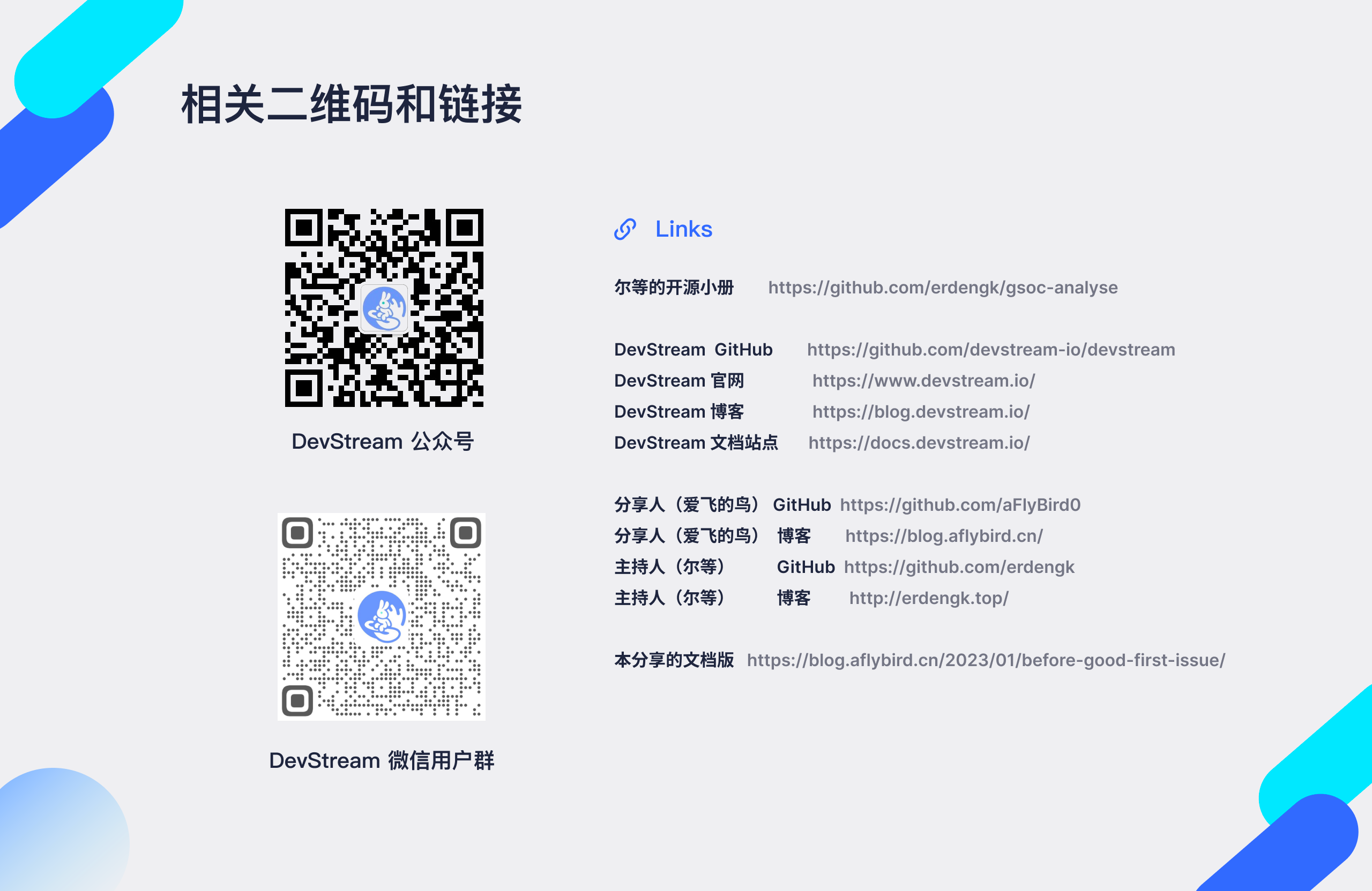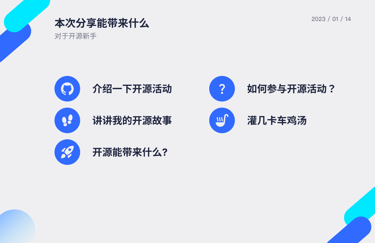 本次分享的主题《Before Good First Issue》,也就是如何参与开源活动,我大概会讲1小时,然后会有随缘时长的Q&A环节,主要是看大家想聊多久了。