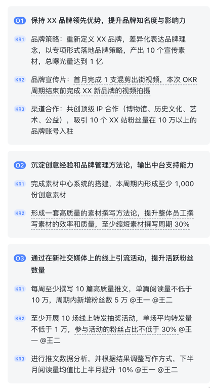 - 每条 O 或 KR 本质上都是一个文档,点进去之后可以记录详情、进度、心得等信息。