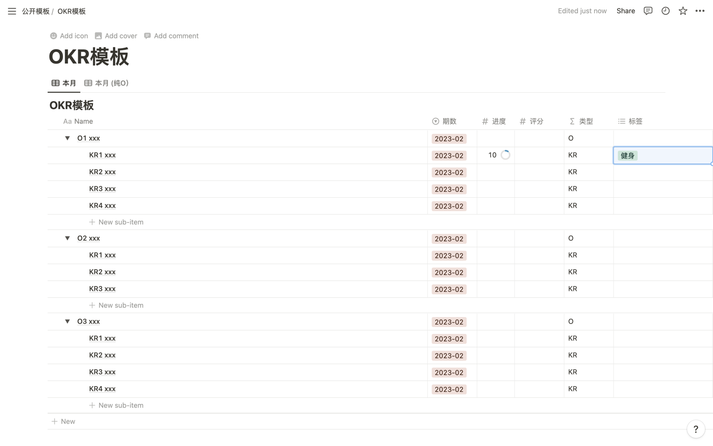 - O 和 KR 本质上都在同一个表格中,每一条都是一个 O 或者 KR。如果某条项目有 「sub-item」,就会自动识别成 O;反之为 KR。