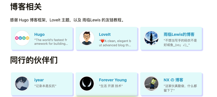 分了若干组(一级标题),每组下有若干个友链卡片,每个友链卡片是一个自定义的 shortcode,格式如下: