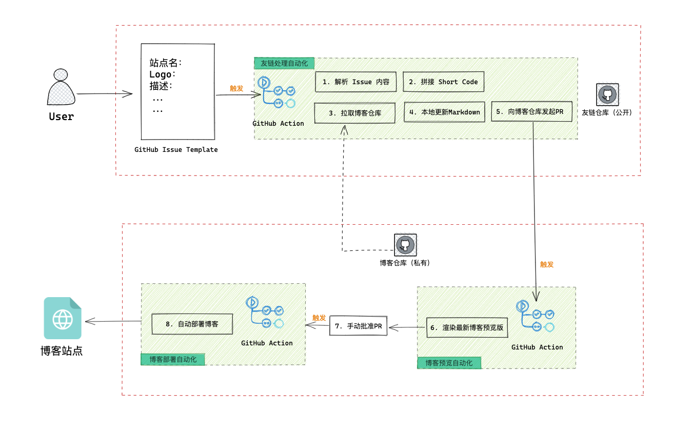 所以友链添加的过程为,小伙伴们通过某种方式告诉我这些信息,然后我更新友链 Markdown,触发 CI/CD。