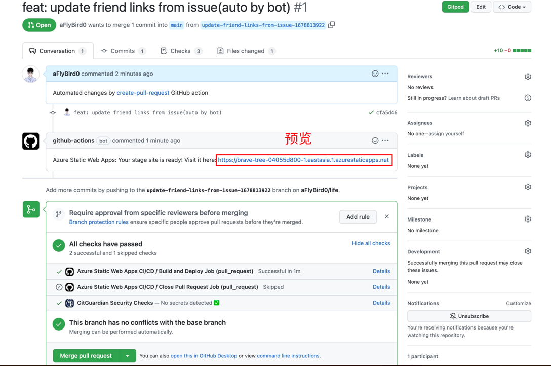 - 微软的 Azure DevOps 会自动帮我生成最新博客的预览链接。(GitHub也是微软家的)
