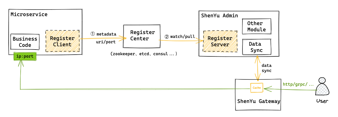 - Decoupling of Register Client and Register Server is achieved using the registration center, making extension easier. However, there is a new cost: each microservice must have the permission to read and write the registration center. Because microservices do not communicate directly with ShenYu Admin (except for the HTTP registration method), but instead write microservice data into the registration center.